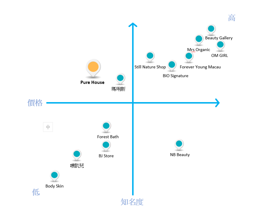 根據分析表格發現,超過五成的店舖價格是高價位,而且售賣代理品牌的店舖價格高;知名度較高而價格相宜的競爭對手較少,所以本店會定位在有一定知名度而價格較親民。